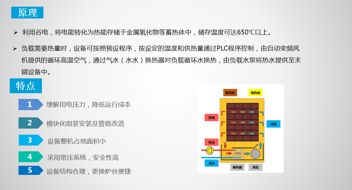 • 利用(yòng)谷電(diàn),采用(yòng)電(diàn)阻絲将電(diàn)能(néng)轉化為(wèi)熱能(néng)存儲于金屬氧化物(wù)等蓄熱體(tǐ)中(zhōng),儲存溫度可(kě)達650℃以上。負載需要熱量時,設備可(kě)按照預設程序,按設定的溫度和供熱量通過PLC程序控制,由風機提供的循環高溫空氣,通過氣水換熱器對負載循環水換熱,由負載水泵将熱水提供至末端設備中(zhōng)。